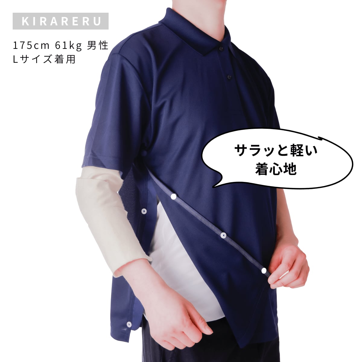 「腕・肩・手首・鎖骨の怪我や骨折」などで痛みがあり、服の脱ぎ着や着替えが困難な方のための服です。ポロシャツは袖口から裾までが開き、優しく包むように着ることができるため、腕をあまり動かすことなく着ることができます。